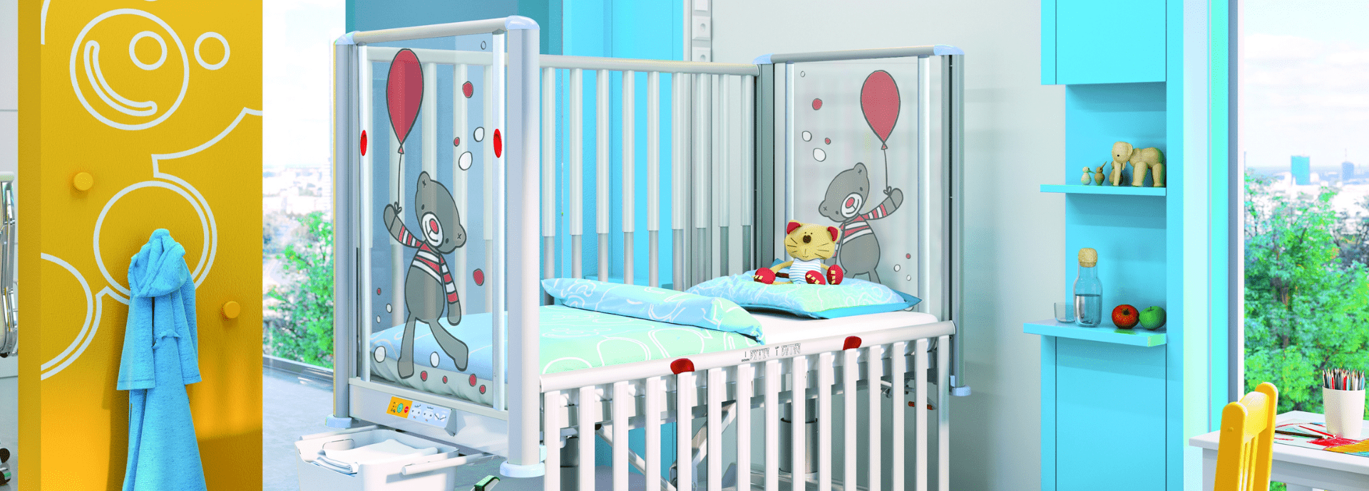 The transparent bed ends allow the child patient constant contact with the surroundings, with parents and staff always being close by. The colour printed motifs of the bed ends fully reflect the playful world of children.