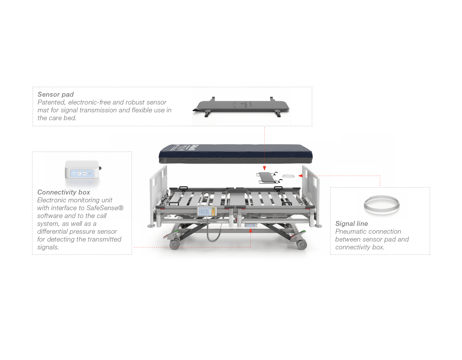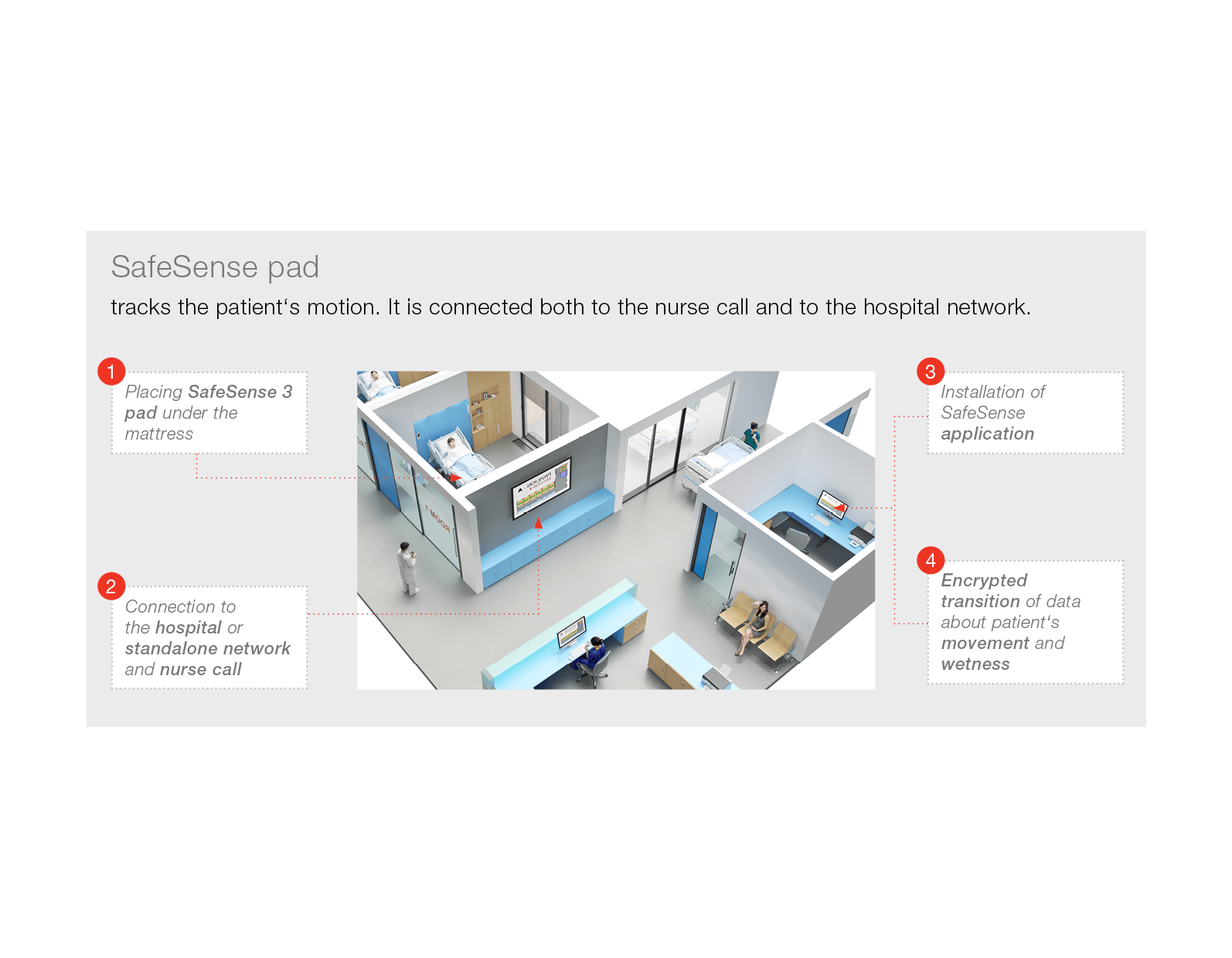 SafeSense 3 equips hospital and nursing beds with monitoring and bed exit alarm capabilities. It provides information on patient's movement and detects wetness to increase safety and help caregivers with their work.