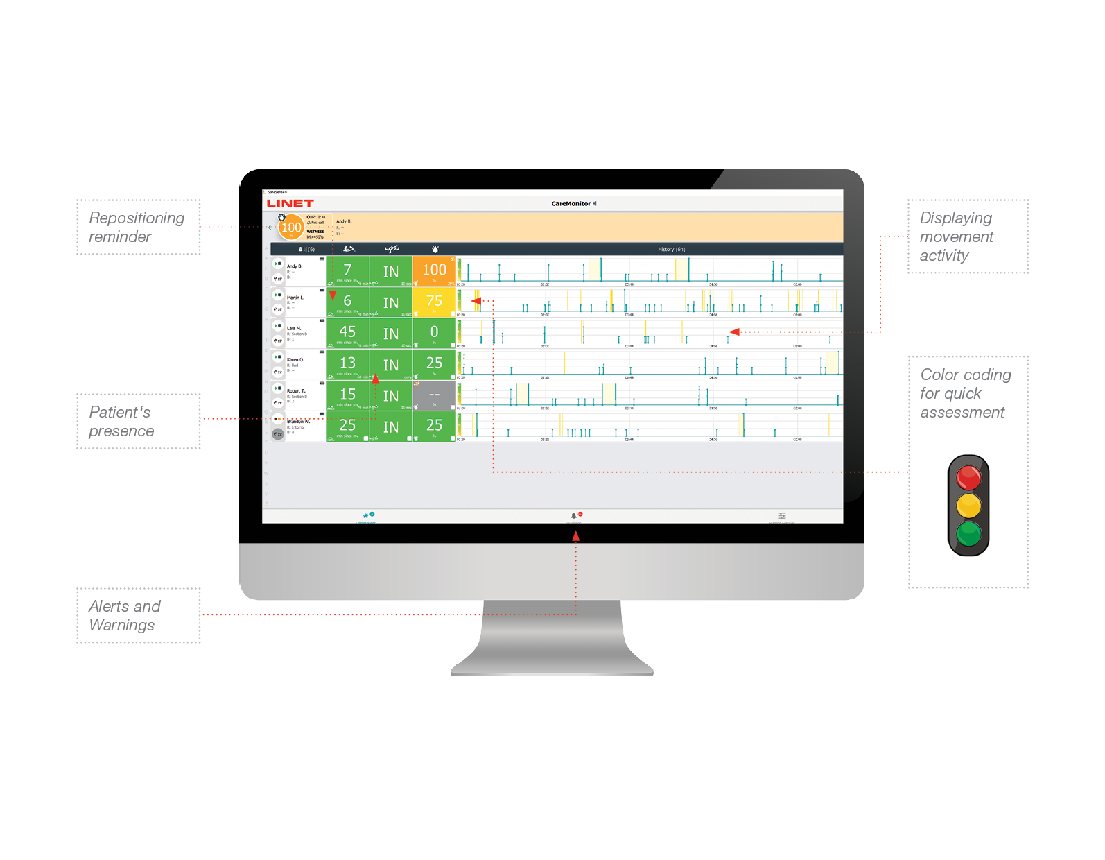Caregiver can get information on patient activity and presence in the bed at a glance.