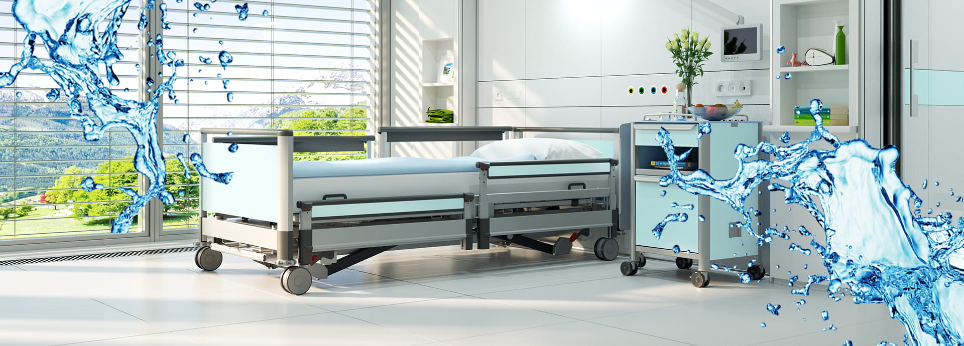 Avec le concept 3 en 1, bien parés pour répondre aux exigences croissantes en matière d'hygiène au quotidien dans les hôpitaux. Le lit image 3-w ne fait pas que se conformer aux exigences de l'AK-BWA (cercle allemand de travail pour installations de décontamination de lits et de chariots).