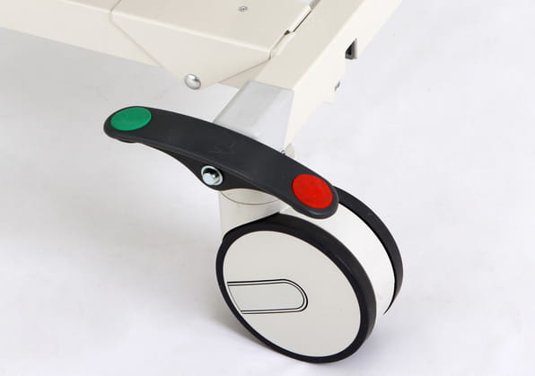 La 5ème roue simplifi e considérablement la manipulation du lit lors d‘un brancardage, notamment dans des espaces restreints. Grâce à la 5ème roue, il est possible de manoeuvrer le lit sur place, sans le soulever. De plus, dans les longs couloirs, elle maintient une direction droite et sans écart.