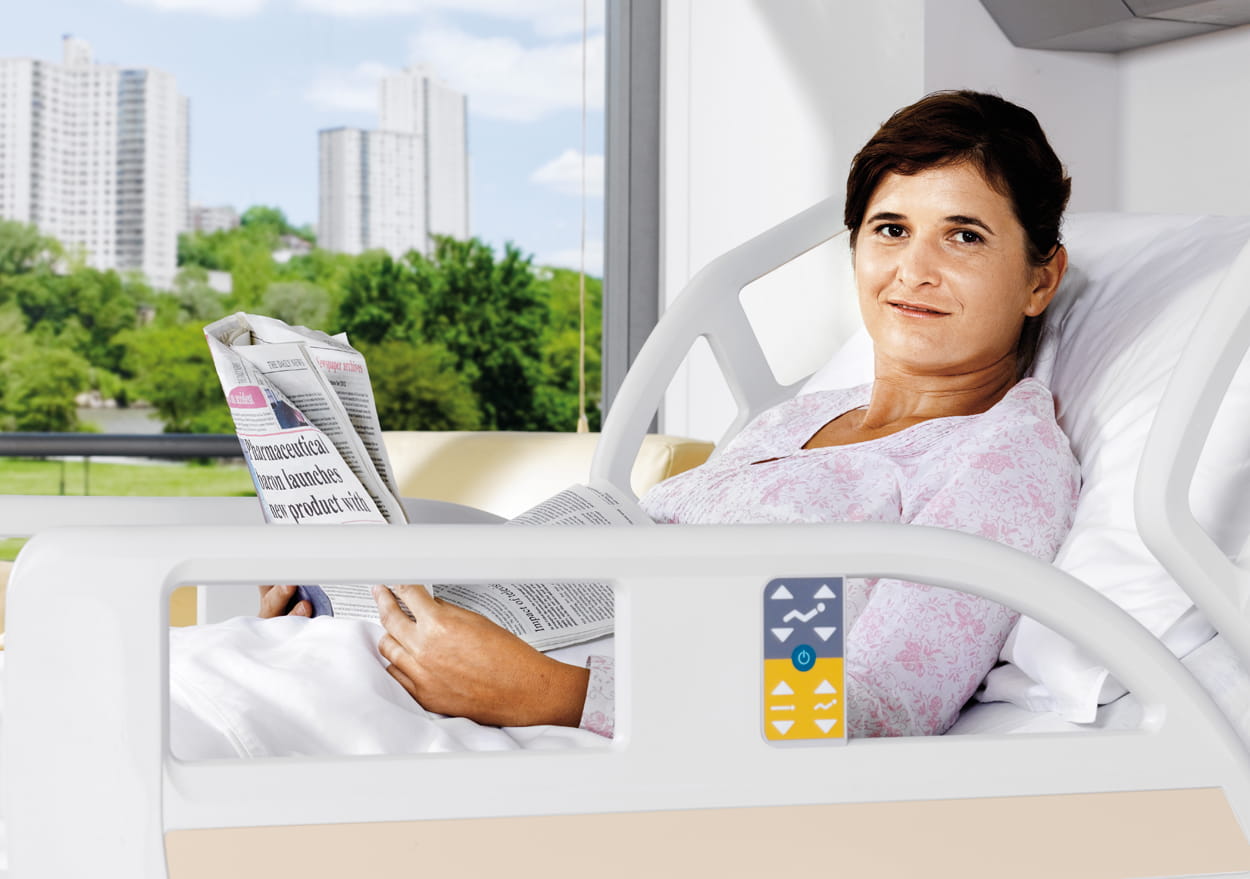 Eleganza 3 influence positivement le traitement des patients en rendant plus simple le travail du personnel soignant à l‘aide de propriétés uniques. Le lit hospitalier moderne n‘est plus qu‘une simple surface de couchage: Eleganza 3 contribue activement aux thérapies et aux traitements grâce à des fonctionnalités innovantes et autres supports de mobilisation intégrés.