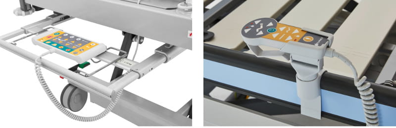 — En actionnant un seul bouton, le plan de couchage s’arrête automatiquement à 42 cm (en montée ou en descente) et le buste se lève pour accompagner le patient lorsqu’il sort du lit