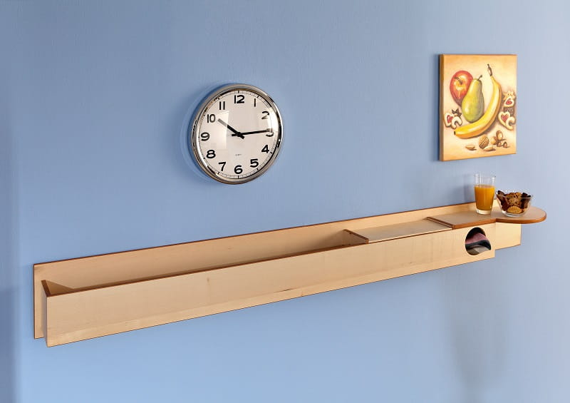 Étagère stimulation et collation conçue pour que le résident puisse prendre une collation et ainsi créer une expérience positive. L'utilisation de deux couleurs lui permet de mieux repérer les contours et minimise le risque de blessures.